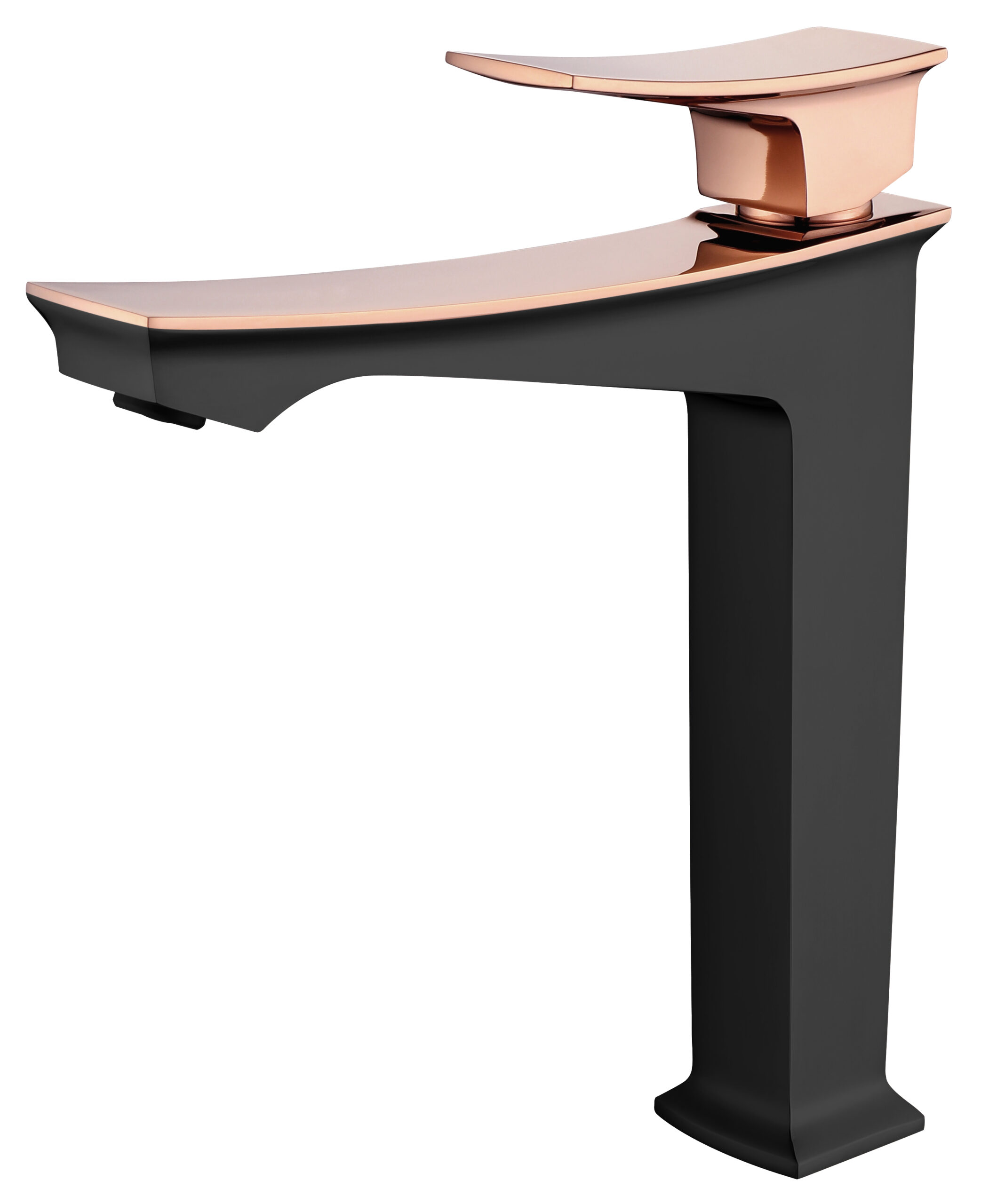 Decorative Long Basin Mixer, Solid brass body, for Over-Top Basin, Finish: Rose Gold with Blackm Decorative Handle, Size: 236x206mm, Mixer type: single-handle, Mixer Installation method: standing.