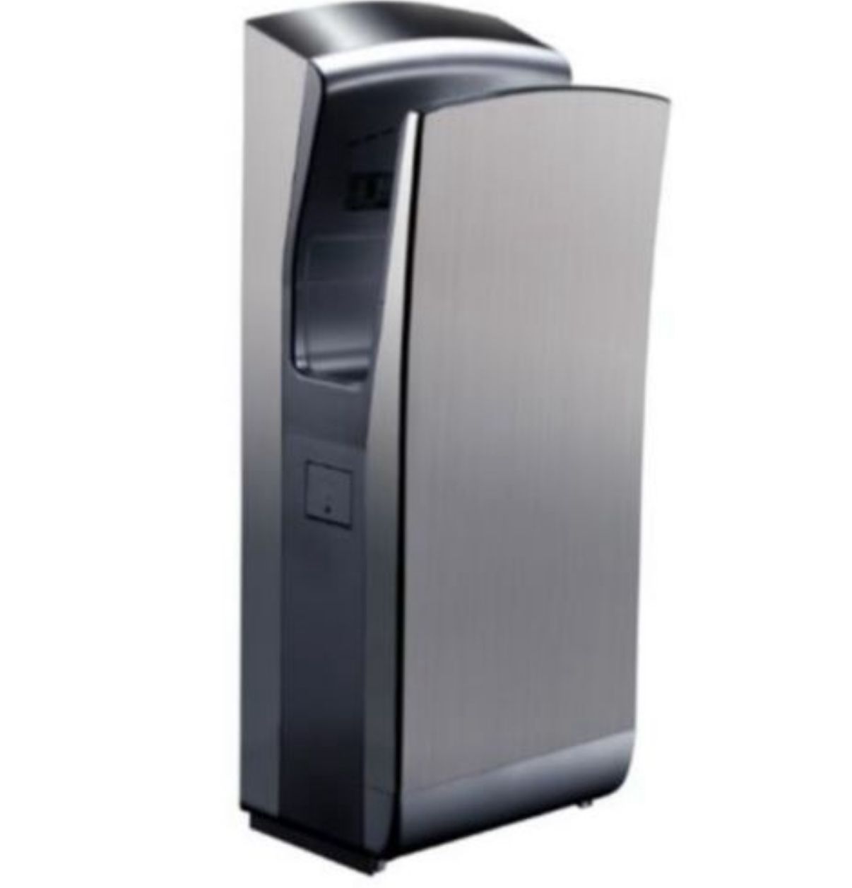 This is a modern, durable hand dryer with a stainless steel body. It has an intelligent heating system that saves energy by adjusting to room temperature, adding heat only when it drops below 25°C.